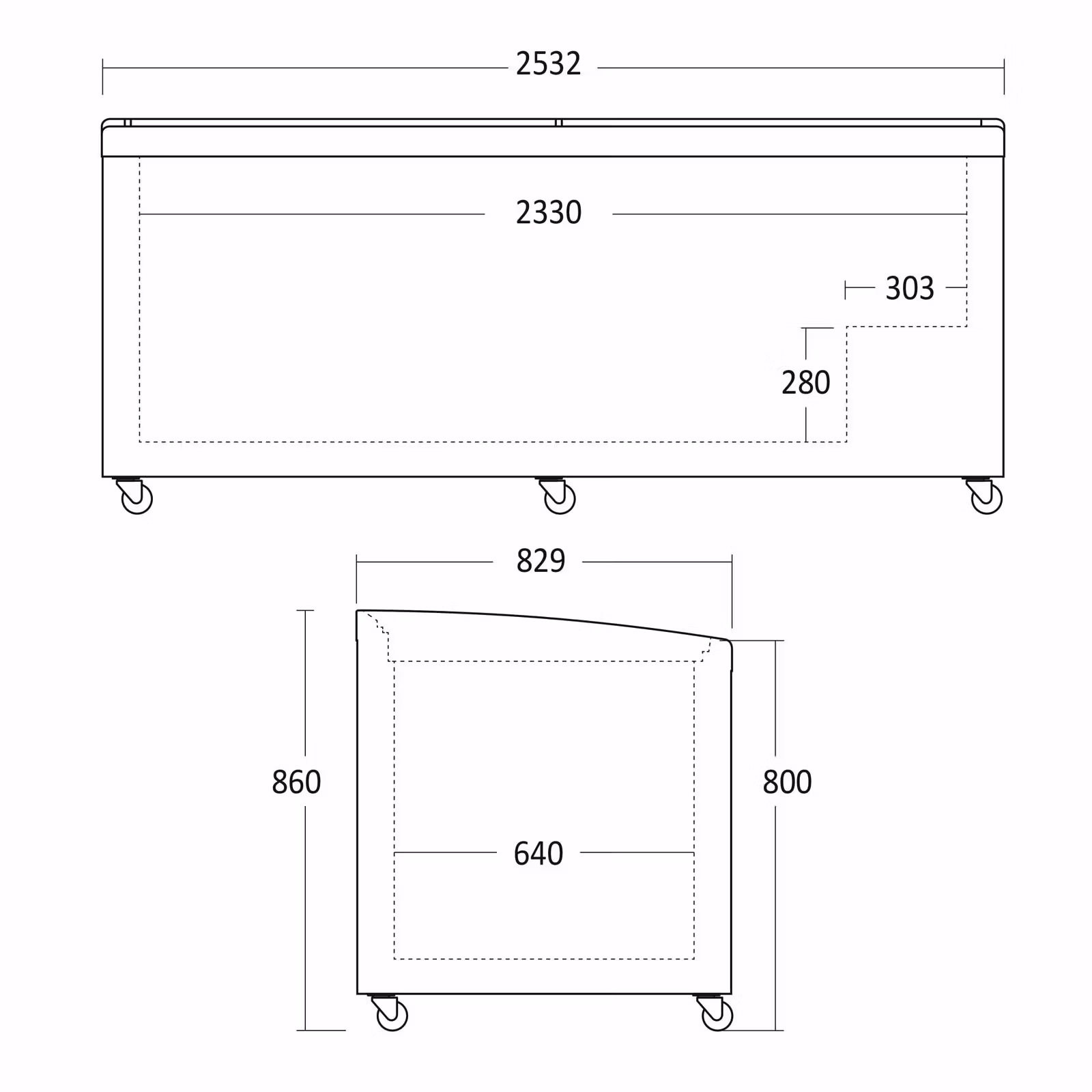Mörkgrå frysgondol för livsmedelshandel. Stora böjda skjutbara glaslock med starka aluminiumhandtag. Frysen har en dubbelfunktion, vilket innebär att den kan omvandlas till kylning 2-7°C. Levereras med 6 kraftiga trådkorgar och 6 starka länkhjul. Frysgondolen har ett innerfoder i vitlackerat stål utvändig stötfångarstång och en digital termometer.