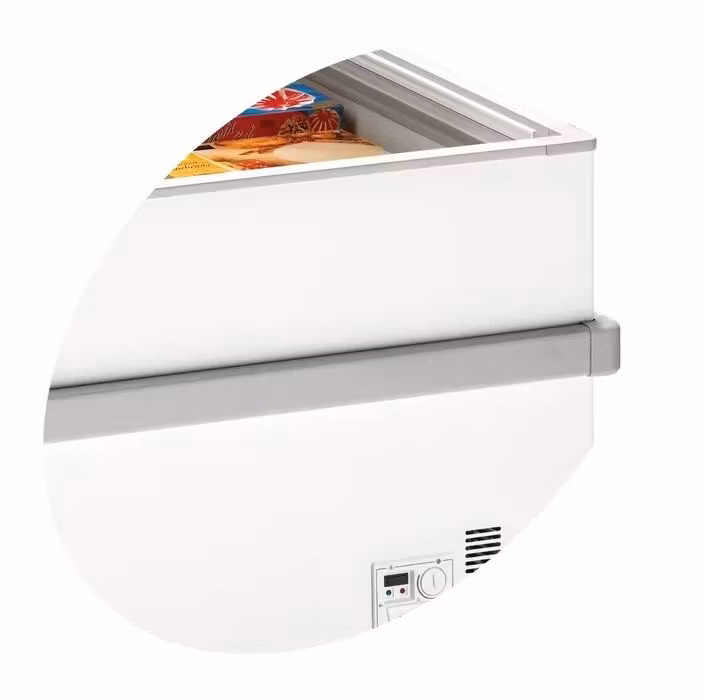 Frysbox till stormarknader av hög kvalitet. Frysen har 597 liter kapacitet och stora glaslock för att skapa en fantastisk visning. Enheten är lämplig för små butiker eller där det finns ett stort behov av större fryskapacitet på en liten golvyta.