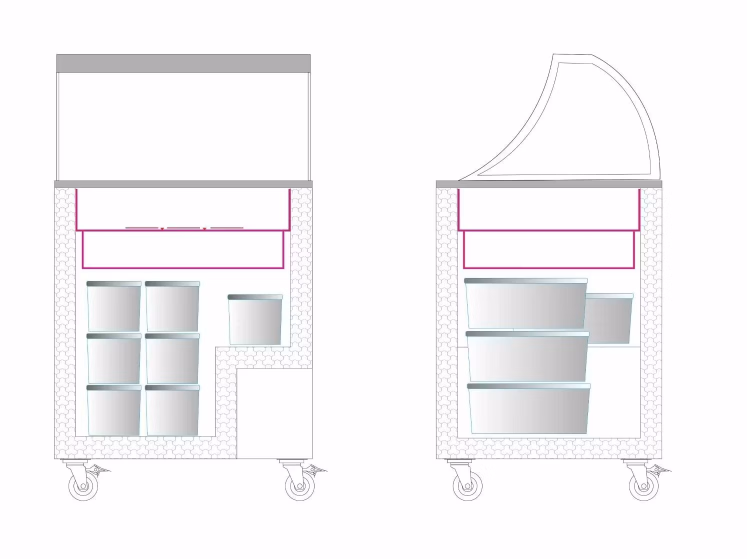 Skopglassdisk IC201SC+SO med stor rund glasmonter för optimal produktvisning. Öppet mot expeditens sida med plana glas skjutluckor. IC201SC+SO rymmer 4 st plast glasstråg 5L. Försedd med hjul för enkel förflyttning, lås och temperaturvisare.