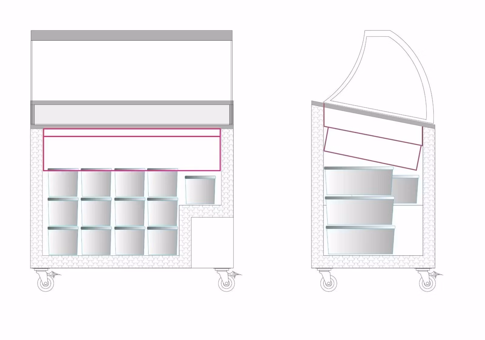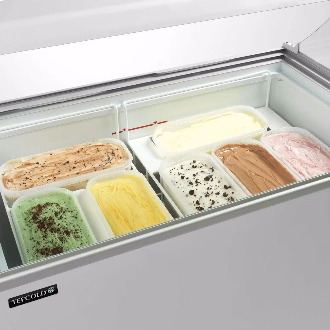 Skopglassdisk IC301SCE+SO med stor rund glasmonter för optimal produktvisning. Öppet mot expeditens sida vinklade glas skjutluckor. IC301SCE+SO rymmer 7 st glasskantiner 5L. Försedd med 4st hjul för enkel förflyttning, lås och temperaturvisare.