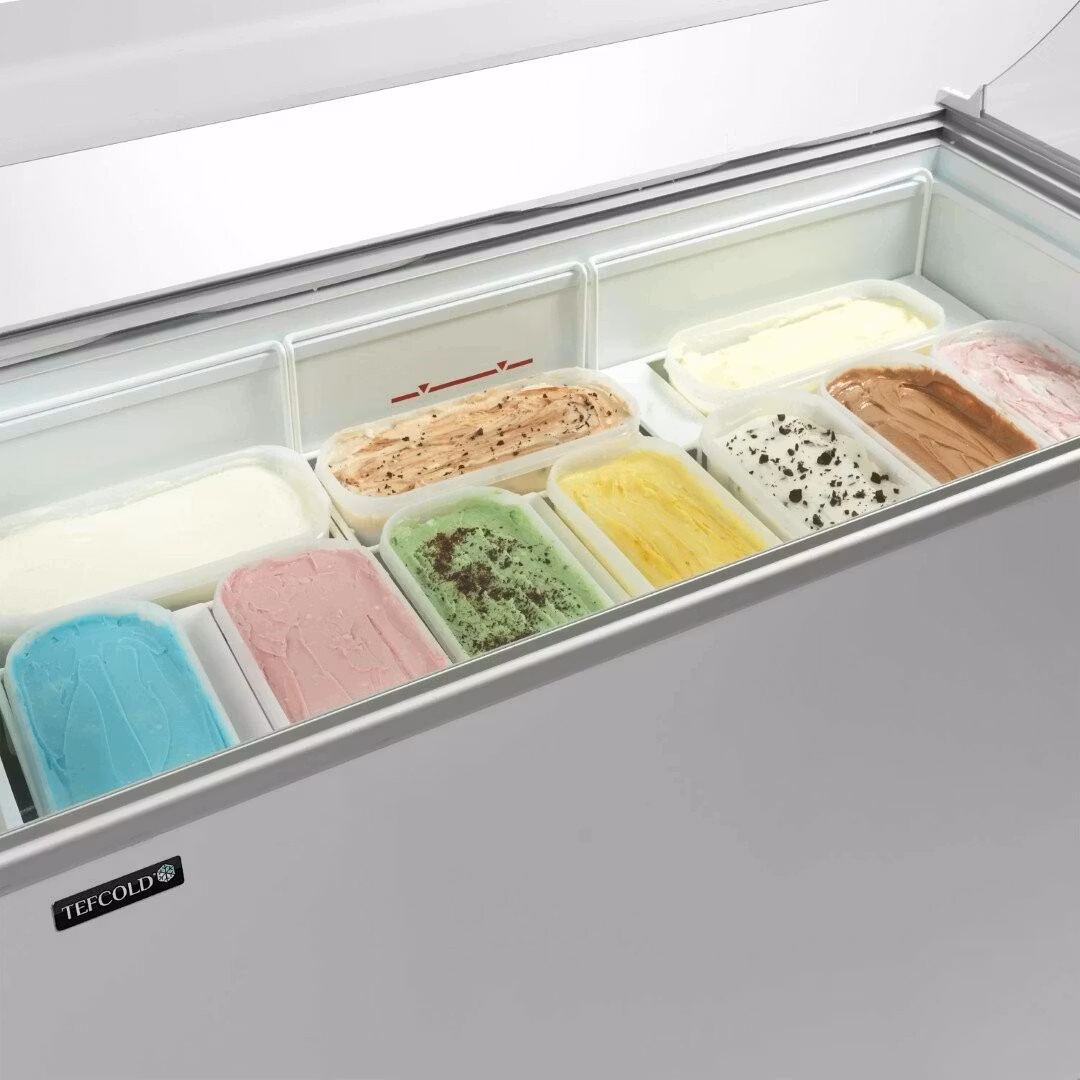 Skopglassdisk IC401SC+SO med stor rund glasmonter för optimal produktvisning. Öppet mot expeditens sida med plana glas skjutluckor. IC401SC+SO rymmer 10 st plast glasstråg 5L. Försedd med 4 st hjul varav 2 låsbara samt lås och temperaturvisare.