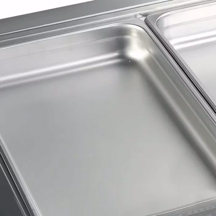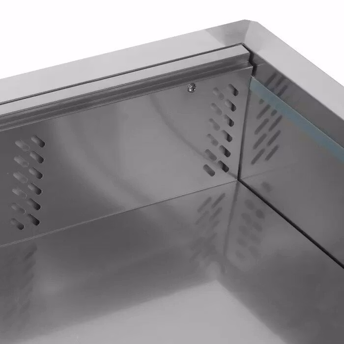 Kylbrunn med ventilerad kyla för infällnad i rostfritt utförande både in- & utvändigt. Försedd med digital temperatur display, automatisk avfrostning och tövattenlåda. Kylbrunnen får plats med 4st GN 1/1 kantiner. Kantiner ingår ej.
