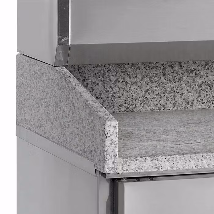 2 dörrars pizzabänk med granitskiva och kylränna. Skåpen är utrustade med skenor för 7 st pizzaplåtar med mått 40x60cm. Pizzabänken har ventilerad kylning, automatisk avfrostning och självstängande dörrar. Kylrännan rymmer 6 x GN 1/3 kantiner.
