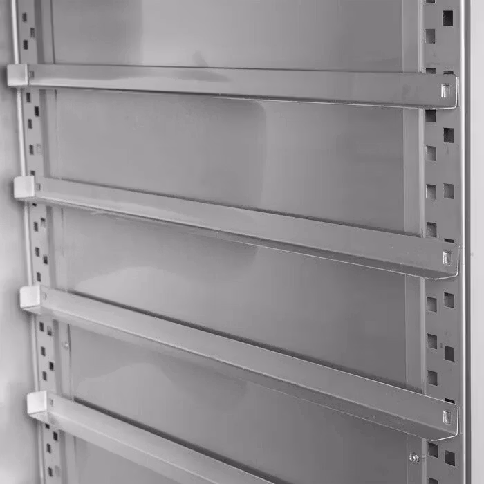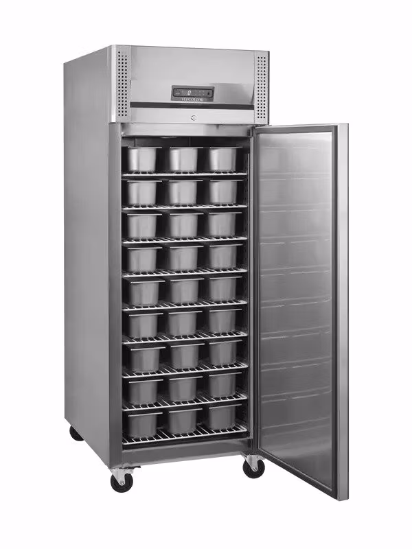 BF850I är en mångsidig frys för förvaring av bakverk och glass. BF-frysen är designad med Euronorm-mått och har 9 skenor för 600x400 eller 600x800mm plåtar, vilket gör organisering och åtkomst enkel. Denna specifika modell har även hyllor som rymmer upp till 54 Napoli-kantiner. Temperaturen är enkel att justera på den digitala termostaten. Plåtar eller Napoli-kantiner ingår ej.