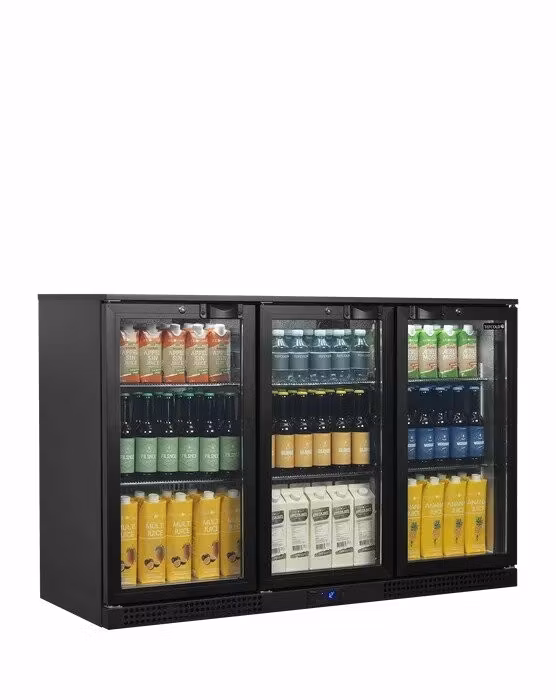 Barkylskåp med fläktkylning och tre hängda dörrar.
