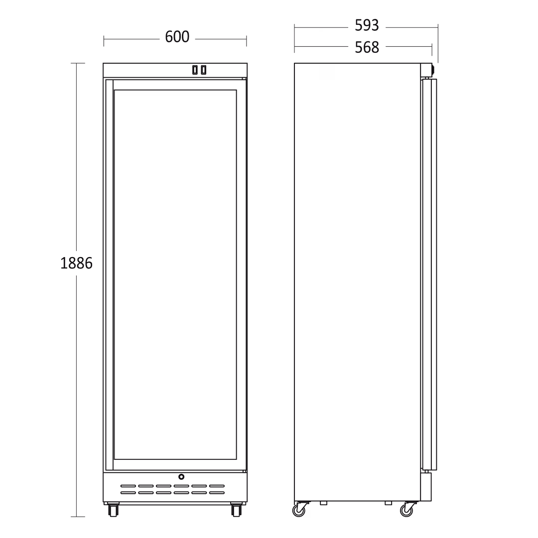 Drickakyl DC 389 WD som passar bra i butiker, stormarknader, caféer, restauranger, pizzerior, bensinstationer etc. Drickakylen är mycket lämplig för självbetjäning, vilket ger goda möjligheter att placera skåpet strategiskt för att skapa fokus och merförsäljning. Drickakylen kommer med 5 vita trådhyllor som säkerställer att alla typer av glas, burkar och flaskor står stabilt på hyllorna. Skåpet har 4 kraftiga hjul så att det alltid går lätt att flytta vid behov, även när det är fullt. Kylen har gångjärnsdörrar med lås, dörrarna stängs automatiskt.