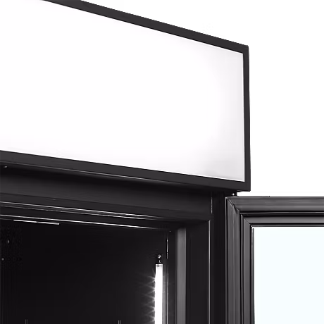 FSC-serien är försedd med lystop. Denna möjlighet till anpassad marknadsföring drar ögonen till sig och stimulerar impulsköp. Enheten håller dryckerna kylda samtidigt som den presenterar och marknadsför produkterna på bästa sätt. Denna modell är ett populärt val för affärer, närbutiker och stormarknader. Den har svart exteriör och interiör. Den levereras med 5 justerbara svarta trådhyllor, 2 självstängande hängda glasdörrar, 2 vertikala LED-belysningar i fullängd i dörramen och en lystop med LED belysning.