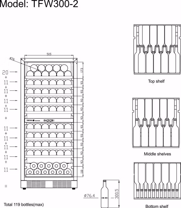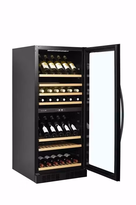 Svart vinkyl med glasdörr är ett elegant alternativ för förvaring och visning av vinflaskor. Den har en snygg glasdörr från kant till kant och utdragbara trähyllor som ger enkel åtkomst till flaskorna. Den vita LED-belysningen visar vinflaskorna snyggt mot skåpets svarta insida. Förutom den exklusiva designen har vinkylen också ett modernt kylsystem som minskar skåpets värme-, buller- och energiförbrukning.