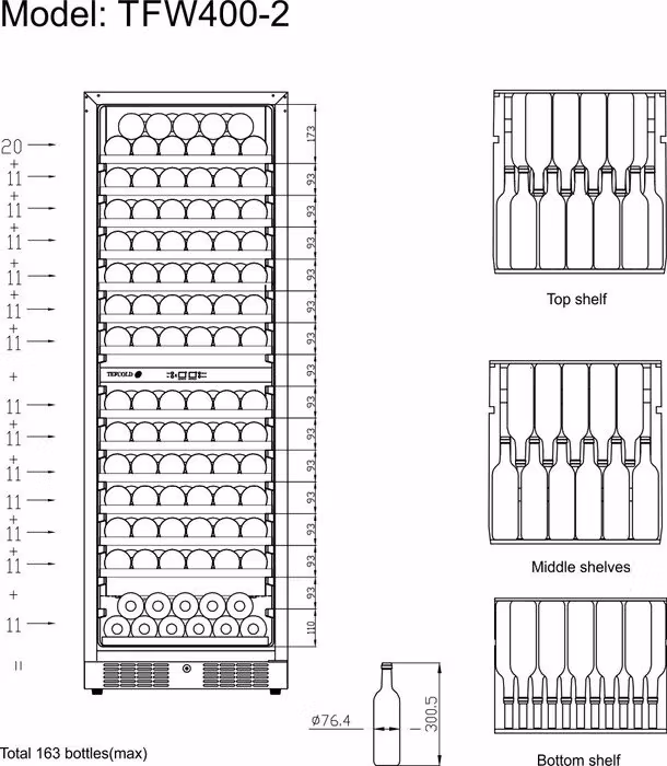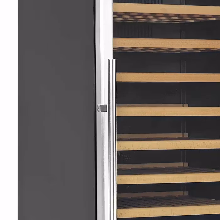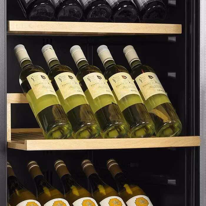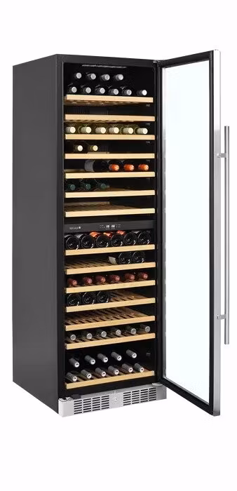 Svart vinkyl med glasdörr är ett elegant alternativ för förvaring och visning av vinflaskor. Den har en snygg glasdörr med dörrkarm och handtag i rostfritt stål.från kant till kant och utdragbara trähyllor som ger enkel åtkomst till flaskorna. Den vita LED-belysningen visar vinflaskorna snyggt mot skåpets svarta insida. Förutom den exklusiva designen har vinkylen också ett modernt kylsystem som minskar skåpets värme-, buller- och energiförbrukning. Den här modellen har två temperaturzoner som kan ställas in med maximalt 10°C skillnad, vilket innebär att du kan förvara t.ex. vitt vin vid 7°C i en zon och rött vin vid 17°C i den andra zonen.