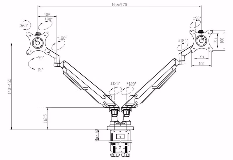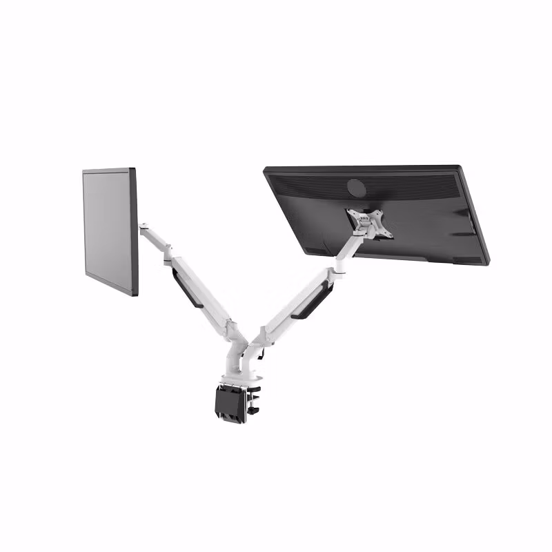 Den vita monitorarmen EASY har 2 sammankopplade armar för att kunna bära 2 displayskärmar med en rek. max. belastning på 2-9 kg. Displayhållarna fungerar bra till skärmar som är 17-32 tum, vilket oftast är dom vanligaste storlekarna i ett vanligt kontor. En någorlunda modern skärm som är 32 tum väger knappt 4kg.