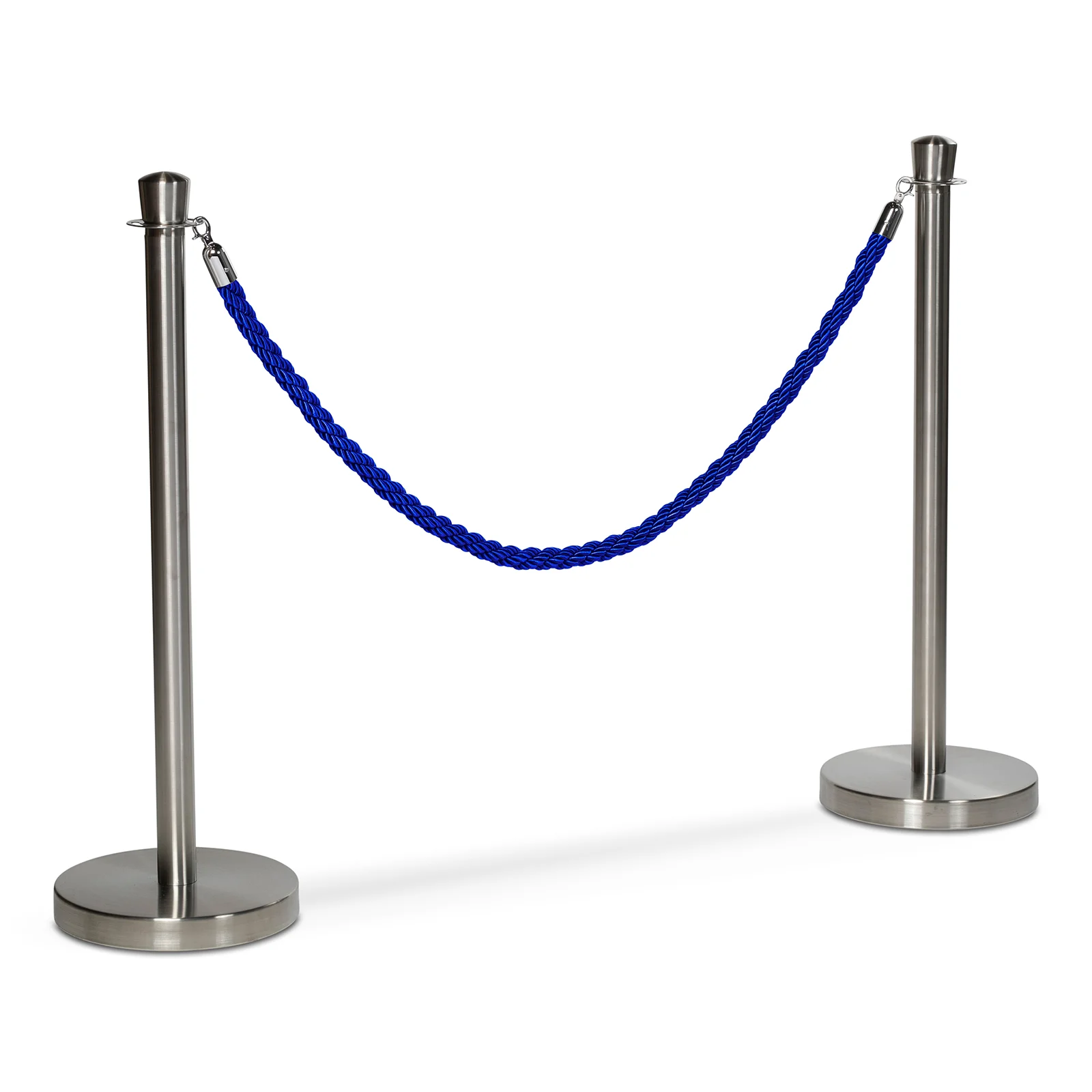 Flätat rep I blått och silverfärgade hakar för köstolpar. Skapar en tydlig avgränsning och finns i flera färger för enkel anpassning efter miljö och behov.