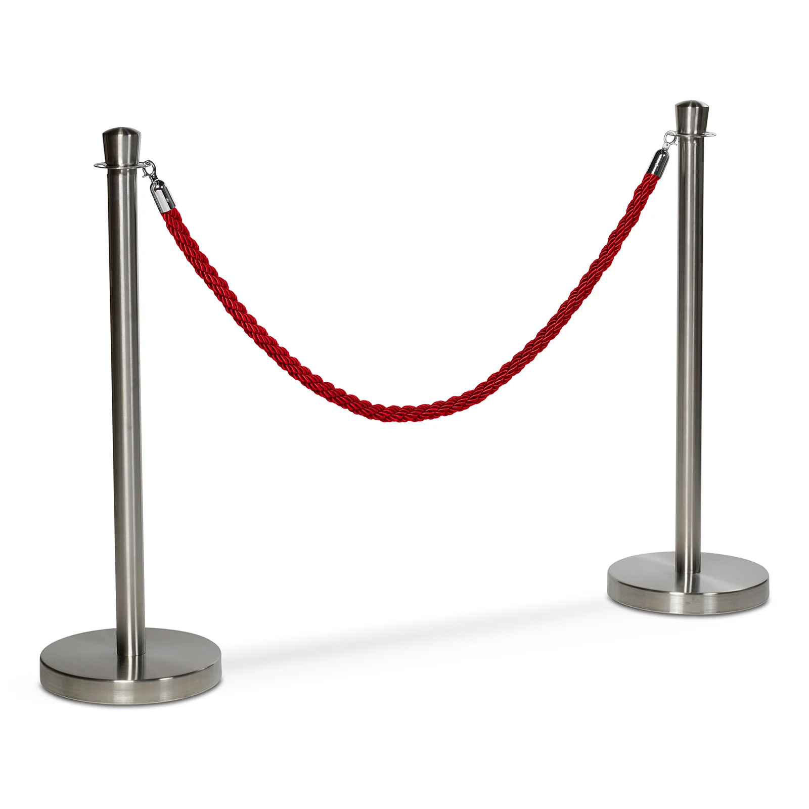 Flätat rep I rött och silverfärgade hakar för köstolpar. Skapar en tydlig avgränsning och finns i flera färger för enkel anpassning efter miljö och behov.