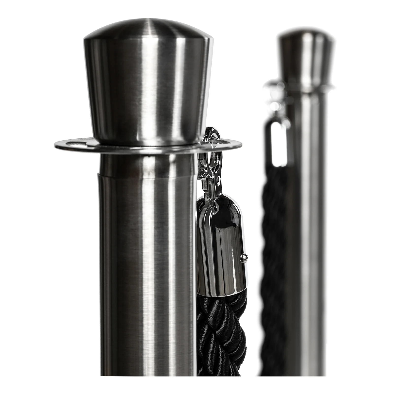 Klassisk köstolpe i set om 2 stolpar av rostfritt stål samt 1 fätat svart rep. Kan användas för att skärma av entrén eller i set om fler för att skapa en lyxig ingång.
