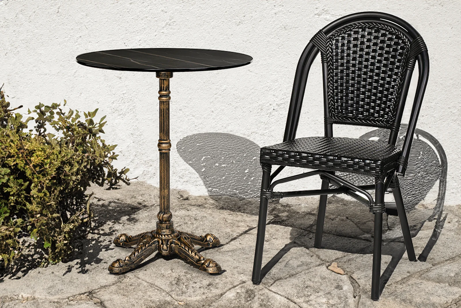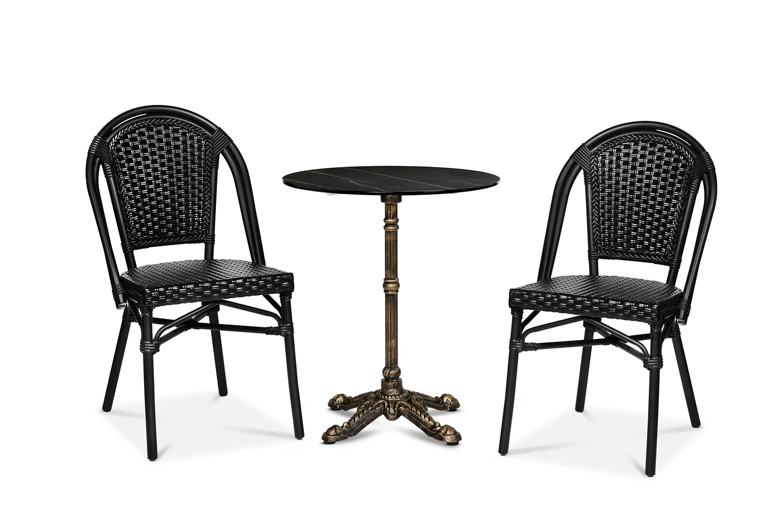 Det är få personer som lyckats undgå att sitta i en stol ur serien Paris. Många caféer och restauranger har denna bästsäljare som sitt förstahandsval. Det är inte svårt att förstå varför. Ramen är uppbyggd av en svart lackerad aluminiumstomme på Ø 28 mm för att säkra en lägre vikt vilket gör den enkel att hantera och stapla, utan att ta upp för mycket utrymme. Sits och rygg är gjorda av svart fiberrotting. Paris-serien är ett bekvämt och hållbart val.
