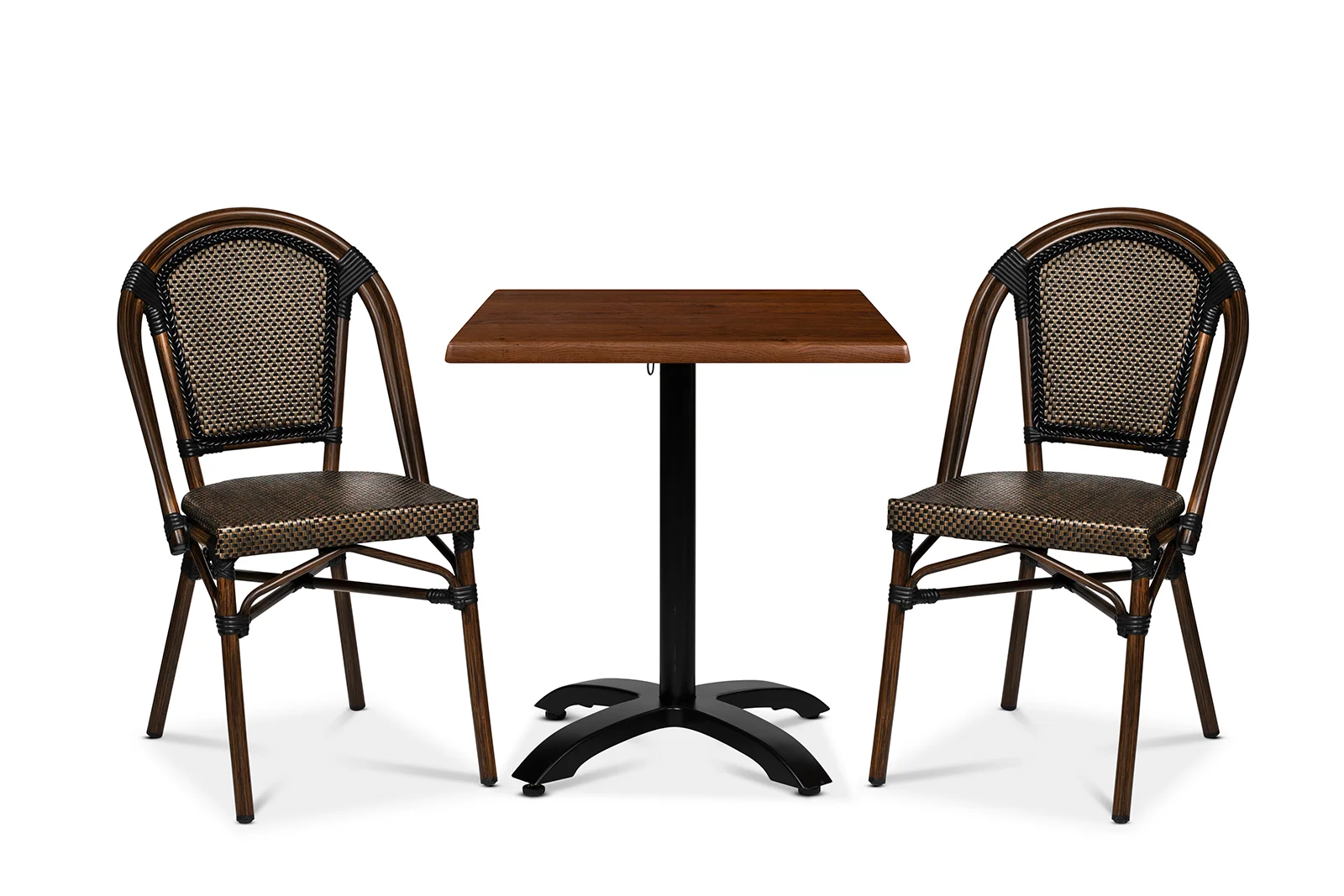 Det är få personer som lyckats undgå att sitta i en stol ur serien Paris. Många caféer och restauranger har denna bästsäljare som sitt förstahandsval. Det är inte svårt att förstå varför. Ramen är uppbyggd av en mörkbrun aluminiumstomme på Ø 28 mm för att säkra en lägre vikt vilket gör den enkel att hantera och stapla, utan att ta upp för mycket utrymme. Sits och rygg är gjorda av svart/brun texteline. Paris-serien är ett bekvämt och hållbart val.