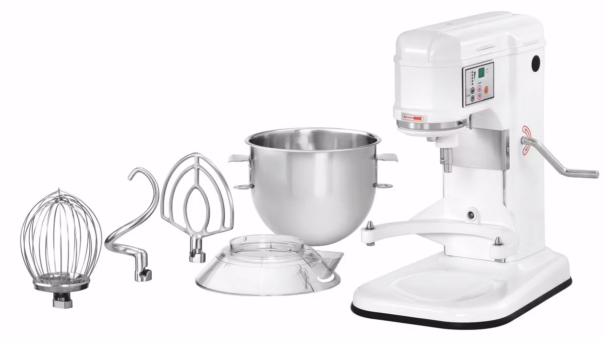 Effektiv, 5-växlad visp- & blandningsmaskin som levereras med degkrok, visp & blandningsspade. Maskinen är gjord av vitt pulverlackerat stål och skålen av rostfritt AISI 304 stål. Utrustad med skyddsgaller, mikrobrytare för galler och skål samt ventilerad motor med motorskydd.