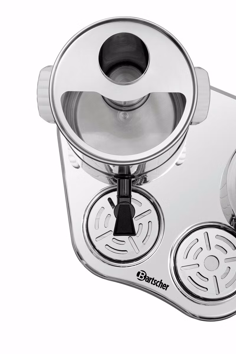 Representativ dubbel dryckesdispenser för kylhållning av kalla drycker på buffén. Tack vare ett kylrör som du fyller med is så bevaras drycken sval under en längre tid. Isröret är enkelt att tömma och fylla på. Botten och locket i rostfritt stål och behållare i polykarbonat.