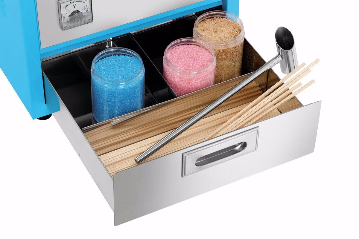 En professionell sockervaddsmaskin som tillåter kontinuerlig produktion av små mängder socker till en luftigt lätt sockervadd. Det rostfria tråget kan tas av och maskindiskas. Ungefärlig produktionstid 30–60 sekunder. inbyggd låda med 3-fack. En reservkuggrem och mätskopa (12–18 g) medföljer.