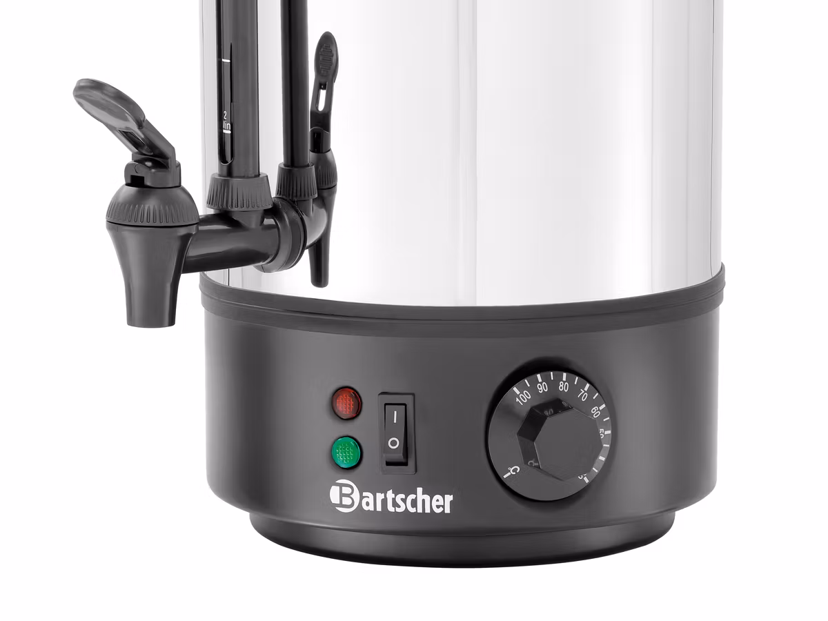 Hetvatten dispenser försedd med tappkran, nivåindikator, termostatvred, on/off knapp och indikeringslampor.