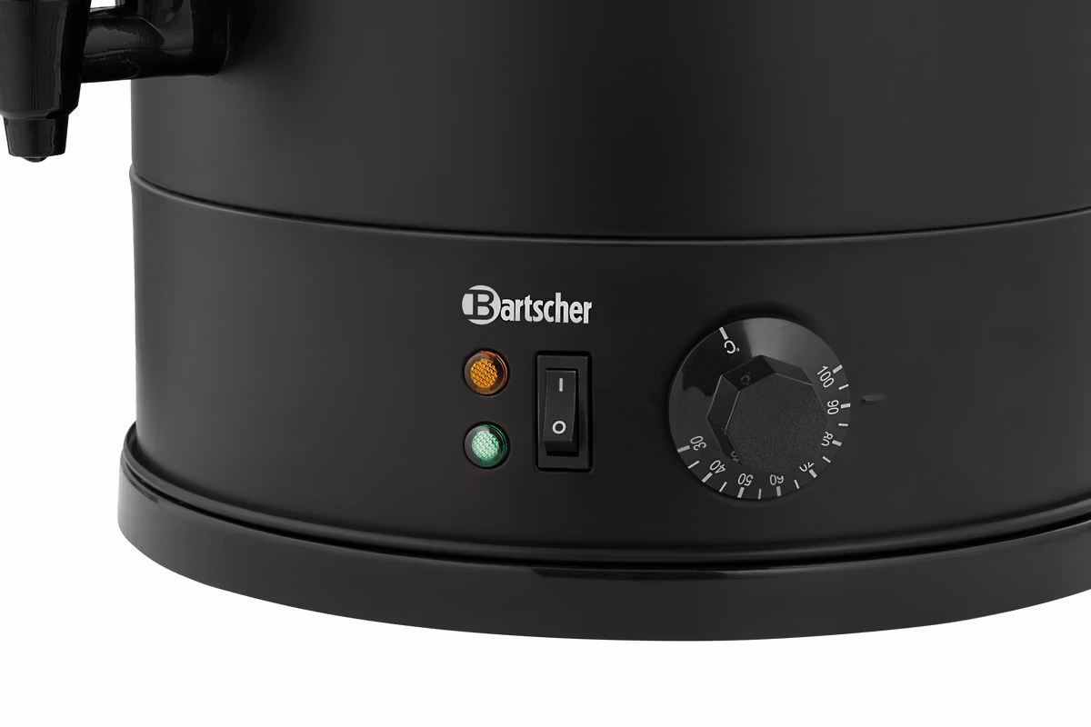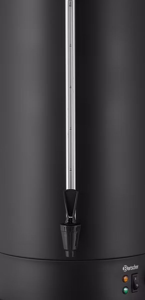 Svart hetvattenkokare för uppvärmning och varmhållning i stor skala. Hetvattensbehållaren har en kapacitet på upp till 28 liter vilket gör att det passar sig bra till stora evenemang utan problem, oavsett om det är i självbetjäningsområdet eller i baren. Steglös termostatreglering från 30 till 100 °C möjliggör exakt uppvärmning och varmhållning. Dubbelvägg isolering minimerar värmeförlusterna och minskar energiförbrukningen under permanent drift. Hölje och lock i rostfritt stål garanterar lång livslängd.