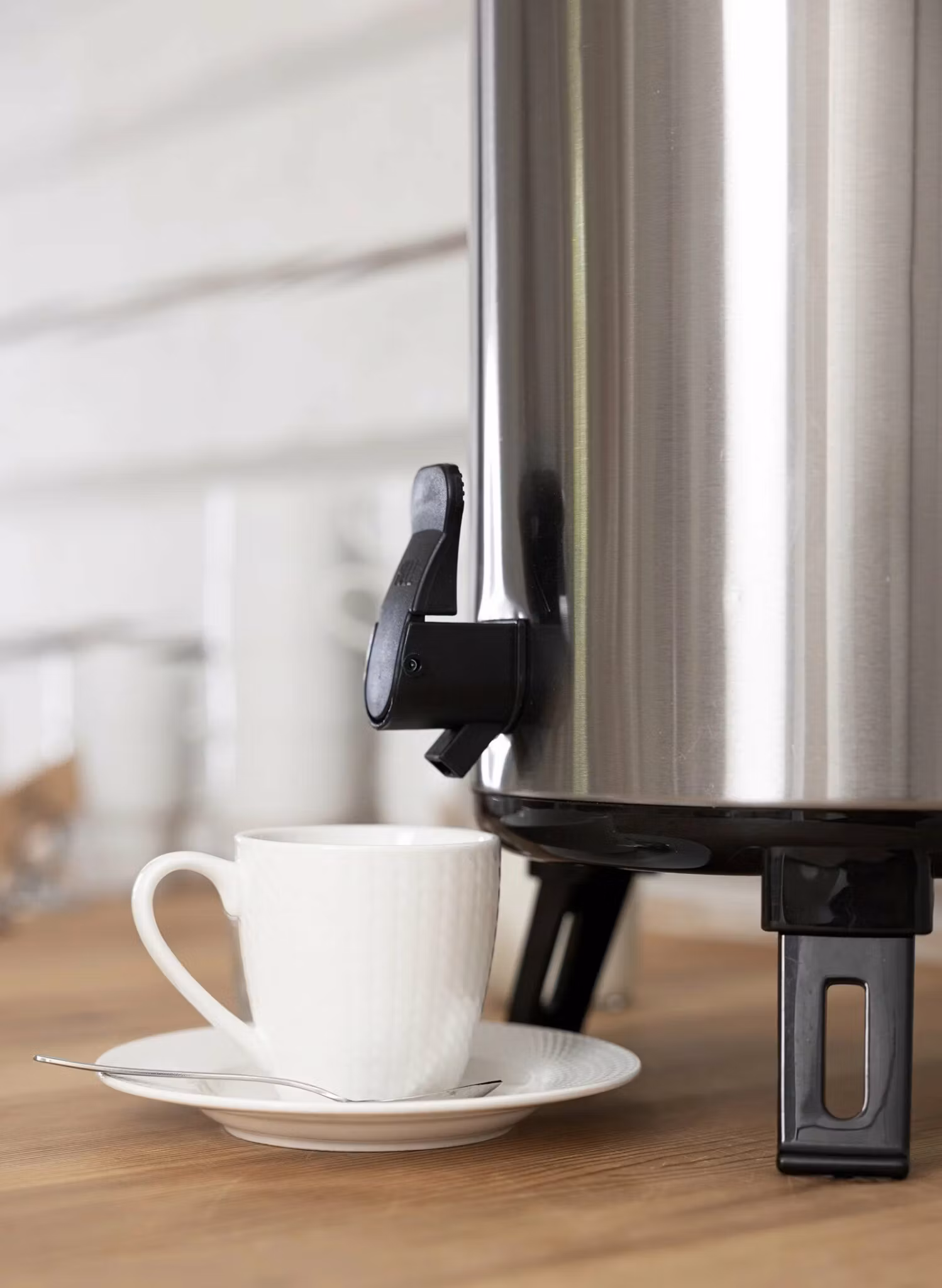 Robust serveringstermos med plats för 9,5 liter. En rymlig och slitstark termos som står stabilt på bordet.. Serveringstermosen håller värmen i upp till 12 timmar. Om termosen fylls med 95 gradigt vatten håller innehållet temperaturen 71 °C efter 6 timmar och 54 °C efter 12 timmar, framtagen för professionella verksamheten.. Avsedd för servering och inte för transport.
