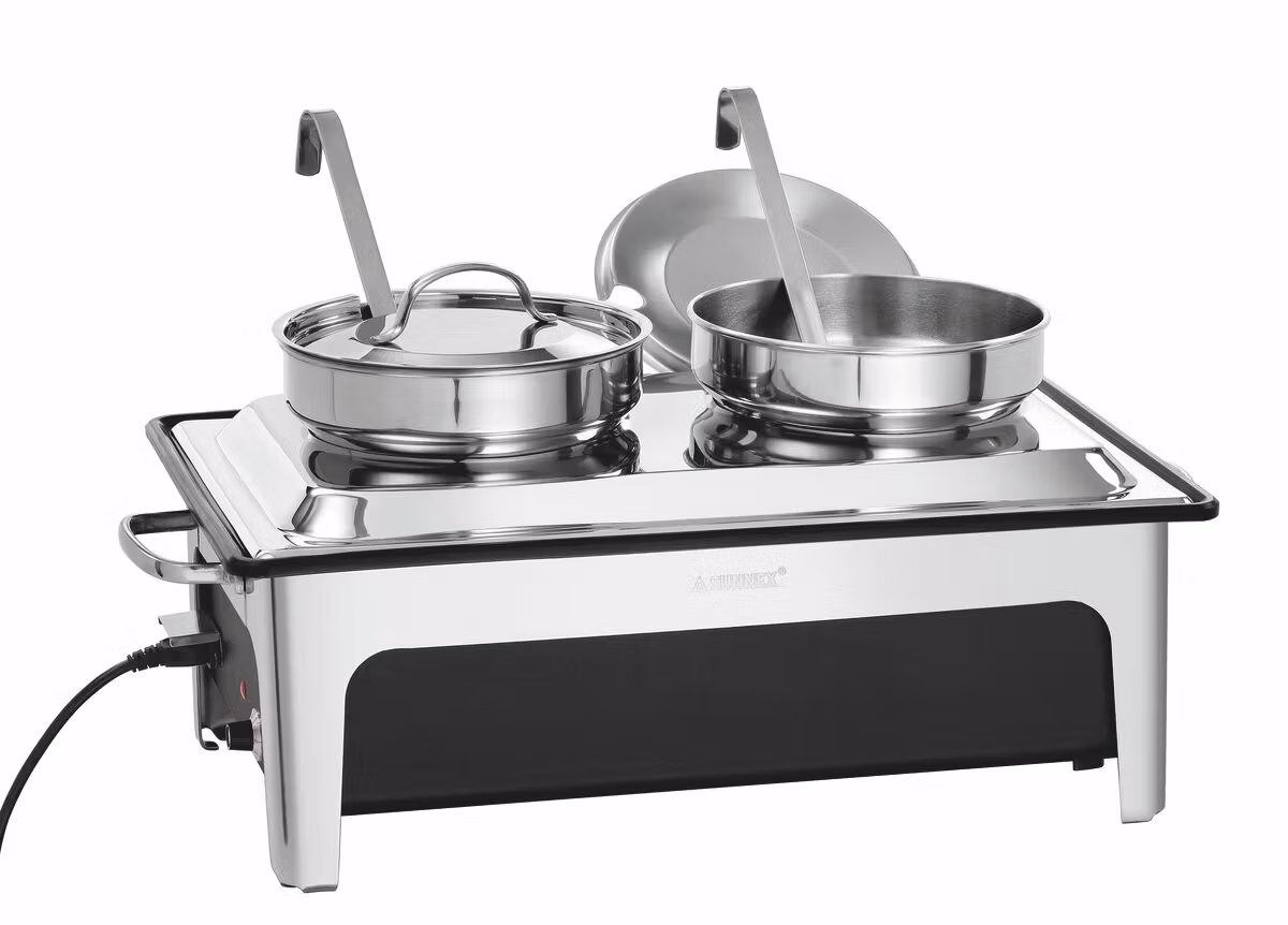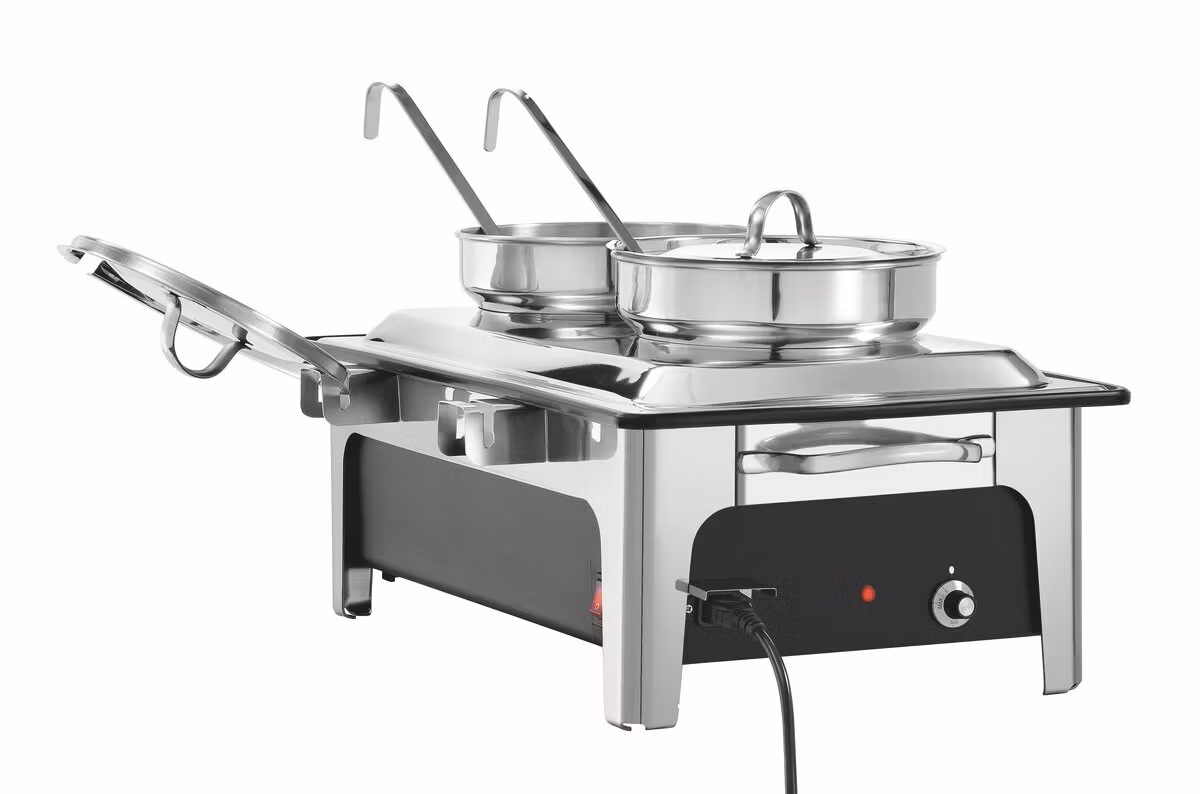 Elektrisk soppstation med spegelblank ram och täcklock i rostfritt stål. Försedd med två 4 liters kittlar med lock, två soppslevar, svart polypropen behållare med inbyggda element, lockhållare, termostatvred och on/off knapp.