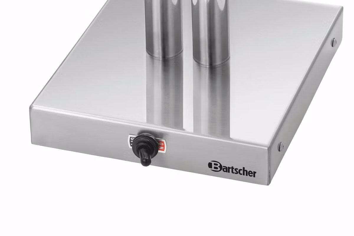 Värmelampa i rostfritt stål med en två rörliga lamparmar. Använd denna värmelampa flexibelt för exempelvis matlagningen och vid buffén.