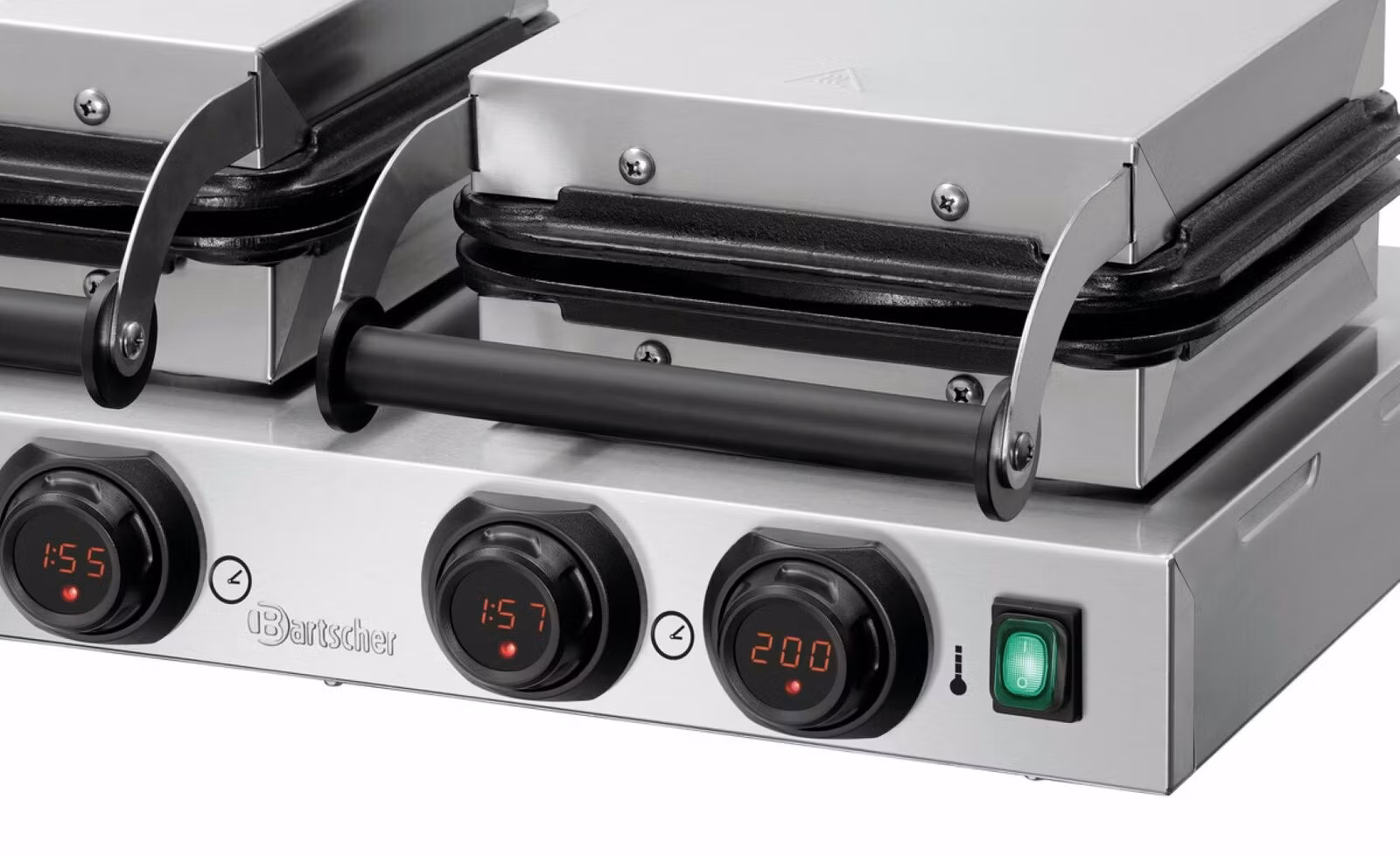 Dubbelt våffeljärn i rostfritt utförande och fastmonterat gjutjärnslagg. Försedd med två reglerbara reglage med digitalindikering, timer och signalton. Det separata på/av-knapparna möjliggör en bekväm och behovsanpassad användning.