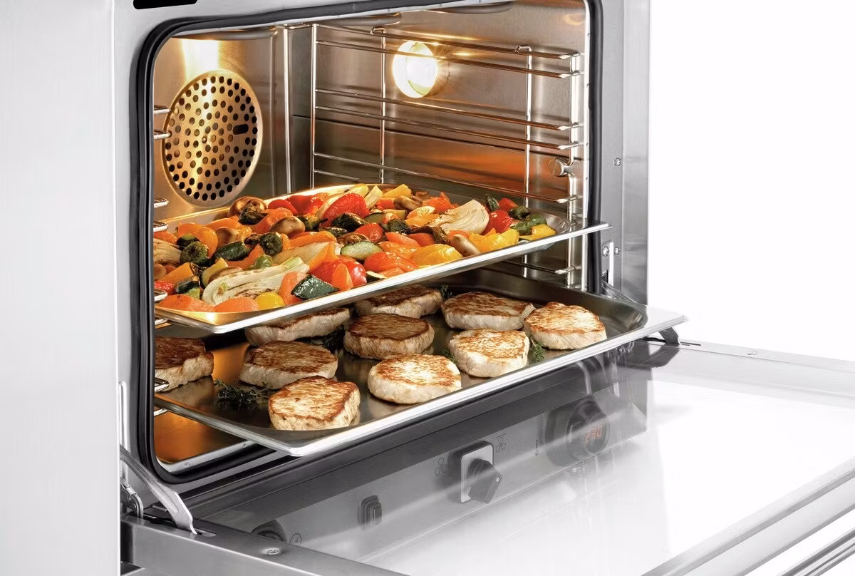 Varmluftsugn för grillning och bakning utformad för mindre verksamheter såsom restauranger, butiker och caféer. Försedd med temperaturvred, timer, luftfuktsfunktion och indikeringslampor.