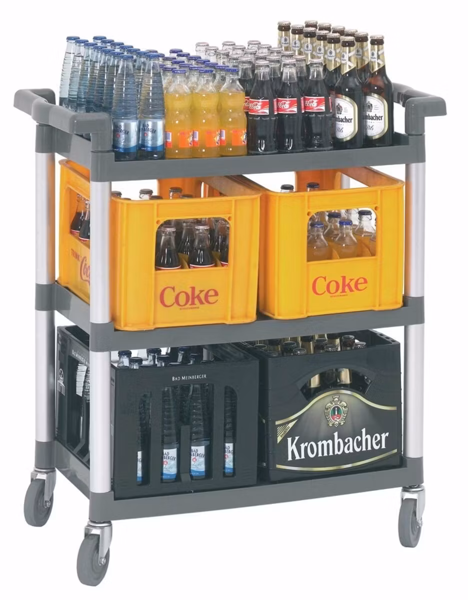 Praktisk serveringsvagn i aluminium och plast. Klarar en bärförmåga på max 120kg. 4 st slitstarka plasthjul.