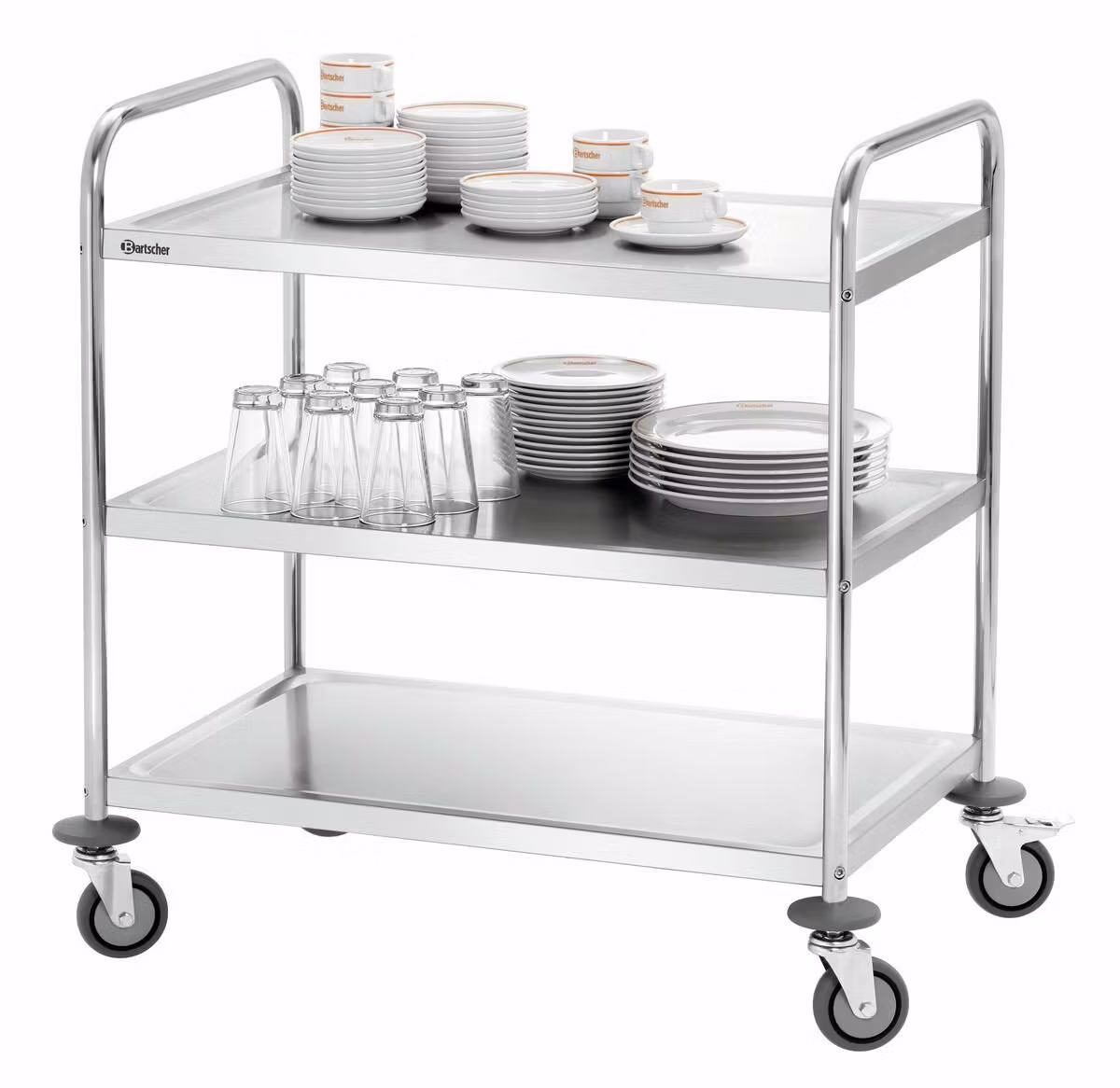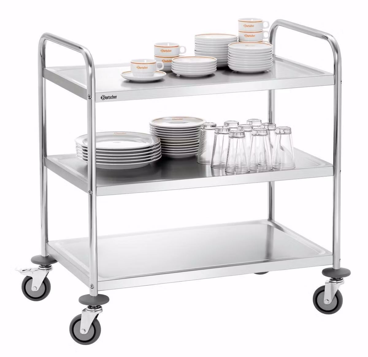Storköksvagn med handtag och 3 hyllplan. Fyra svängbara hjul, varav två med broms. Mellanrummet mellan hyllplanen är ca 265mm.